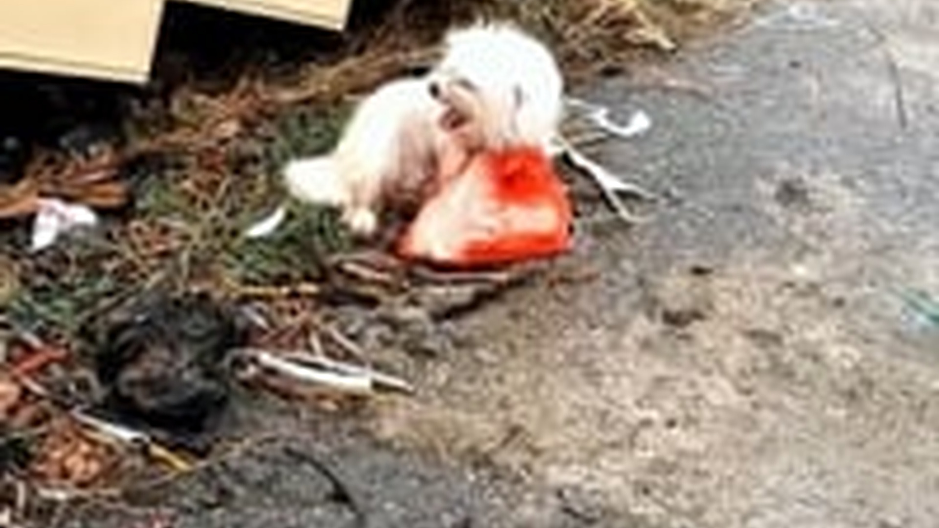 N2104040_Tiny stray white puppy sitting alone beside discarded trash bag Luftgekühlt Tokyo: A Historic Highway Meets Air-Cooled Perfection